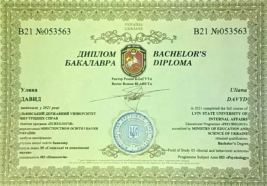 Здобула вищу психологічну освіту в Львівському державному університеті внутрішніх справ, додатково проходжу курси підвищення кваліфікації у напрямку когнітивно-поведінкової терапії.