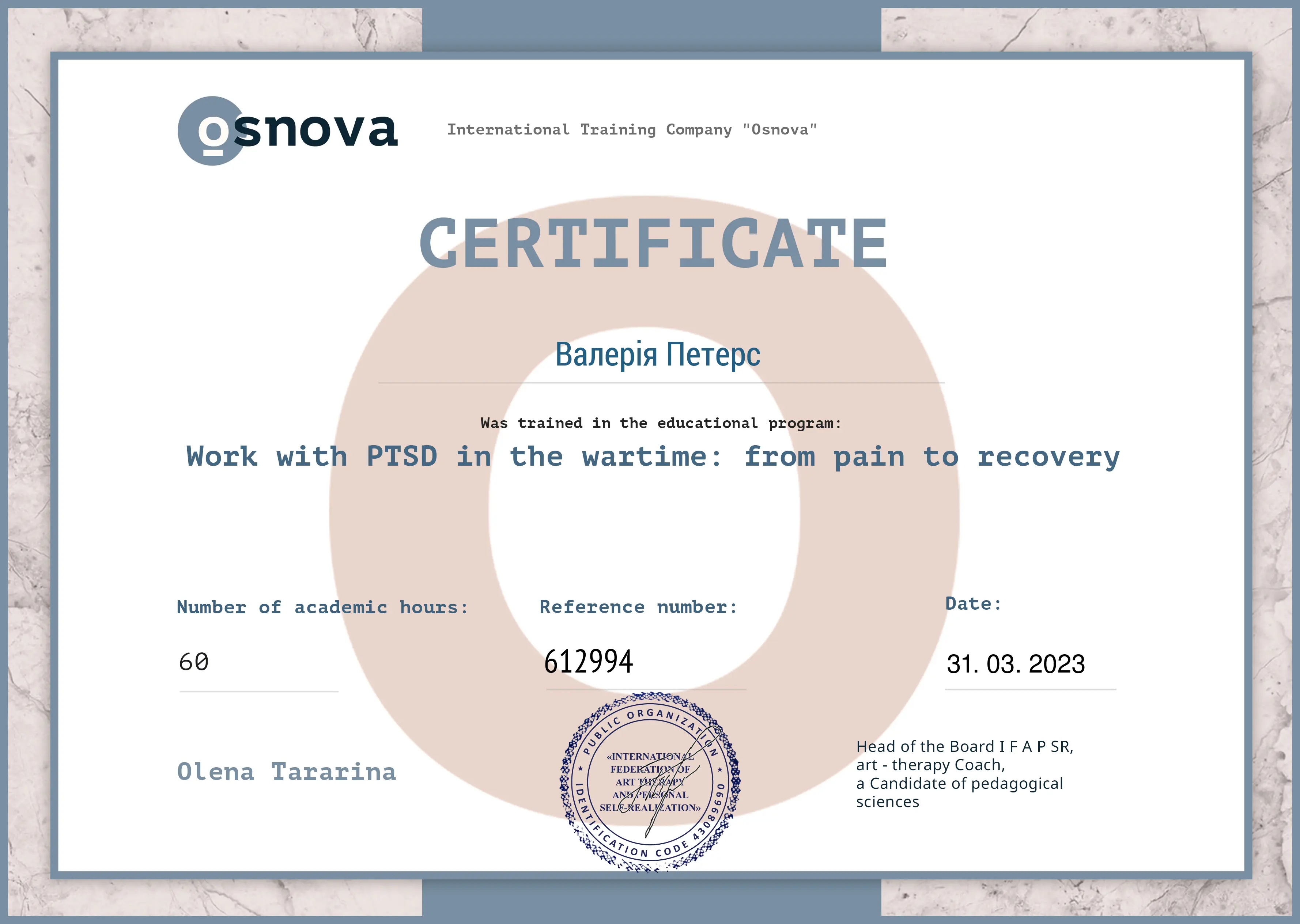 Знає, як приборкати «гострі» емоції та заново закохатись у життя. Використовує методи арт-терапії, що дозволяє наповнитись ресурсами
